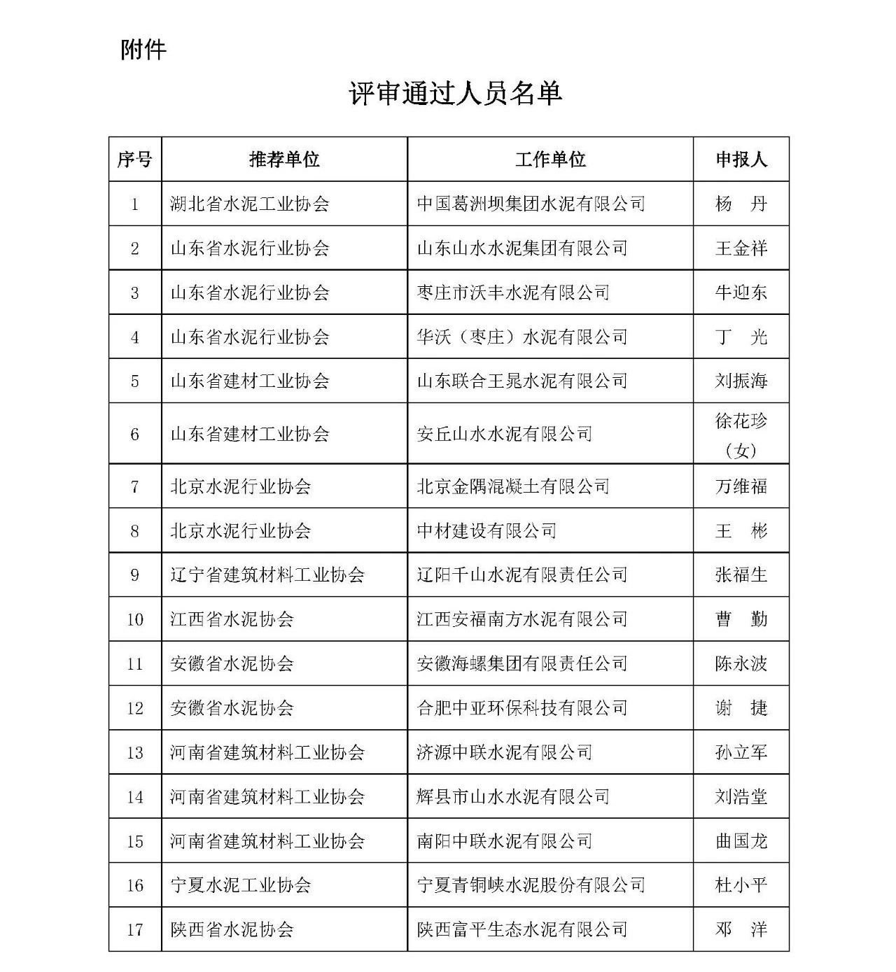 2023年水泥行業優秀總工程師評選工作按照既定程序,由水泥行業領導、專家組成的評選委員會,對各省市自治區水泥(建材)協會推薦的人員及申報資料進行了認真細致的評審,楊丹、王金祥等34人(名單附后)通過了評審,根據《關于開展2023年水泥行業優秀總工程師評選活動的通知》的規定,現予以公式。公示期2023年7月24日起至2023年8月6日止。在公示期間內,如對評審結果有異議,清將意見發送到: